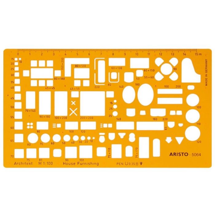 Het Aristo architect meubelsjabloon 1:100 is ideaal voor het nauwkeurig tekenen van symbolen in woon-, slaap- en keukengedeeltes, sanitaire voorzieningen en met niveau- en richtingssymbolen.